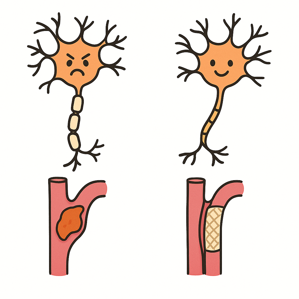 我們很少在急性中風期進行支架置放,除了因為需要使用雙線抗血小板藥物以及快速的再灌流,都可能會增加出血風險。不過最近有些文獻支持在特定狀況下可以考慮進行支架置放,其中就包含了:(1) Tandem Lesion; (2) Rescue Stenting。在一篇Systemic review中(Wei, 2024),總共收納了3187名具有Tandem lesion(顱外頸動脈狹窄 + 顱內大血管阻塞)的患者(共21篇文獻),在急性梗塞性腦中風下進行取栓,同時進行支架置放。研究結果發現,有置放支架的組別在90天量好功能預後顯著優於沒有置放支架組別。另外在出血與死亡率則沒有顯著差異。另一篇文獻(Lee, 2025)亦發現,若在有ICAS的患者進行取栓兩次失敗後,進行支架置放可以改善臨床預後。