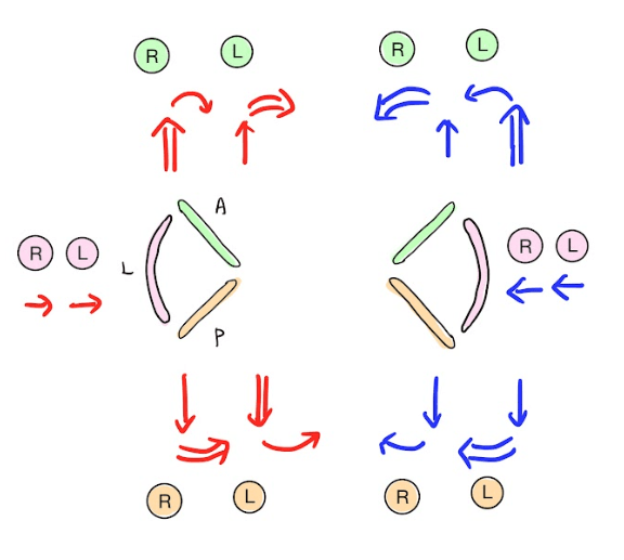 此外,左右兩側分別對應右眼與左眼。等一下在說明各半規管活化時,我們會以藍色代表興奮性訊號。透過這樣的示意方式,可以更直觀地理解不同半規管被刺激時,如何產生對應的眼球運動方向。